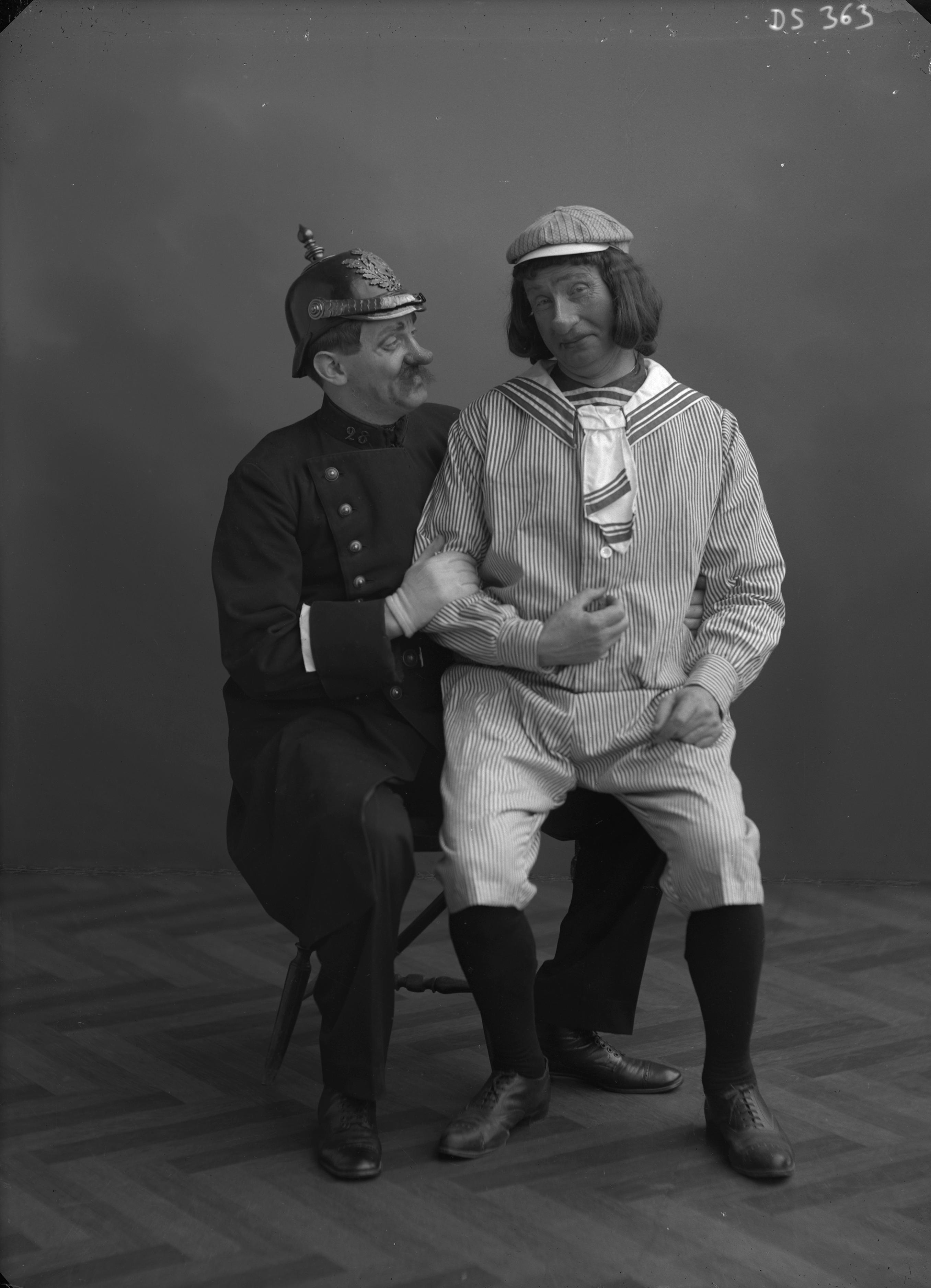 Porträtt i helfigur av medlemmar ur Lianders teatersällskap. Man i polisuniform och man i barnkläder.