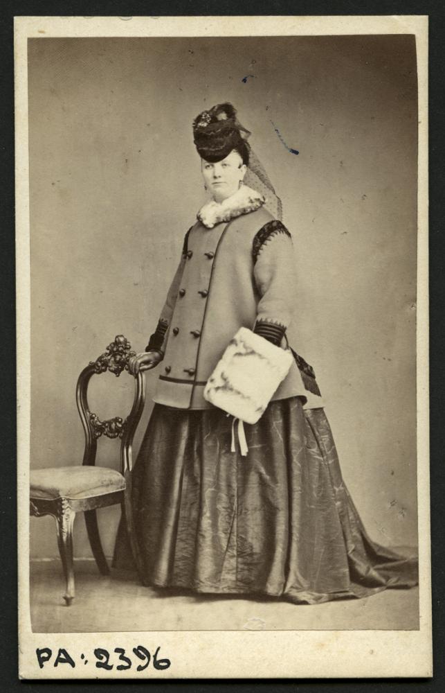 PA 002396 :: kvinna, klänning, damhatt, handmuff, stol