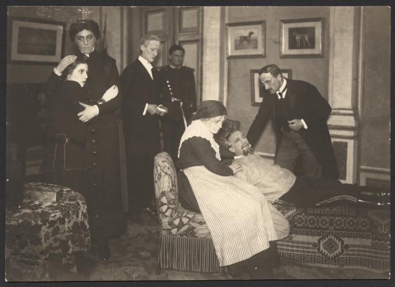 - "Malmö Teater. Strindbergsensemblen Stockholm (20-årsjubileum av Strindergs Intima Teater 1906-1910) 1-3 april 1926". Fr.v. Bertha: Libeth Holm, Laura: Manda Björling, Gösta Gustafsson, Nöjd: Calle Flygare, Amman: Hedv. Neuzén, Ryttm. A. Falk, Doktor Östermark Anton de Verdier.