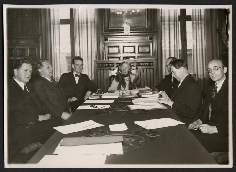 Fr. v. Olof Berthold, Danmark, Sven Backlund, Sverige, Lars Svensen, Norge, Kerstin Hesselgren, Sverige, Halvar Lange, Norge, Gunnar Hirdman, Sverige och Holger Kjaer, Danmark.