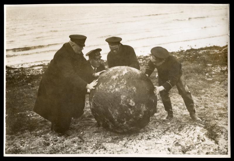 Minor ilandflutna vid Kämpinge. En av de desarmerade minorna föras i land på stranden nadanför Kämpinge by, den 25 november 1939.