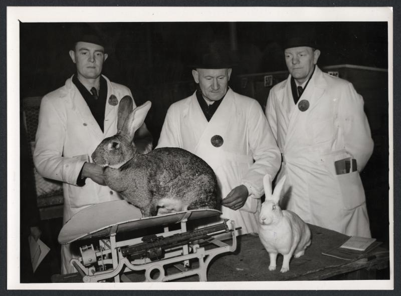 våg, prisdomare, erik lindström, vågar, man, höstutställningar, män, henry ohlsson, belgisk jätte, höstutställning, kaniner, kanin, axel nilsson, lantbruksbinäringarnas höstutställning, lantkanin