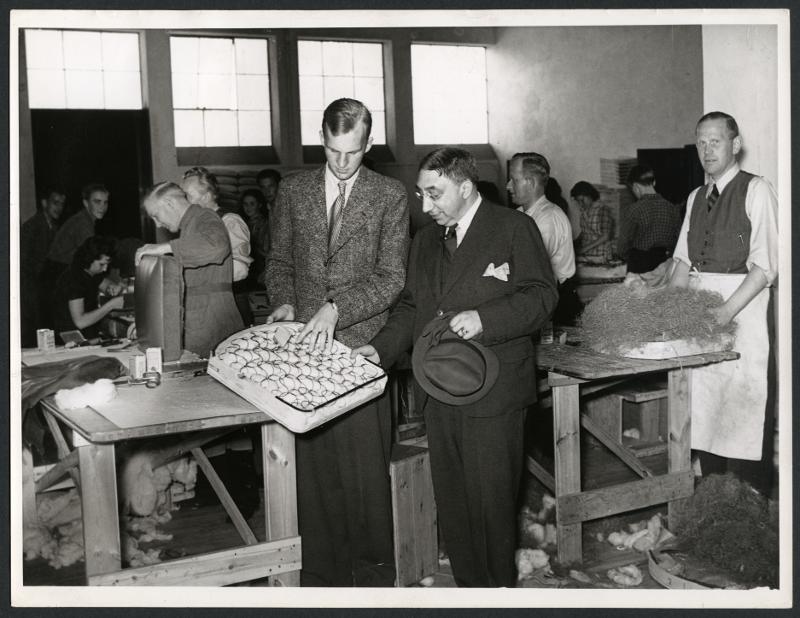 - Doktor Serge de Chessin, den berömde franske skriftställaren, som på tisdagen kom till Malmö besökte under eftermiddagens lopp Malmös nyaste fabriksanläggning, Dux, vars installationer han tog del av och beundrade. Bilderna visar Dr. de Chessin och direktör Erik Ljung vid rundvandringen på fabriken.