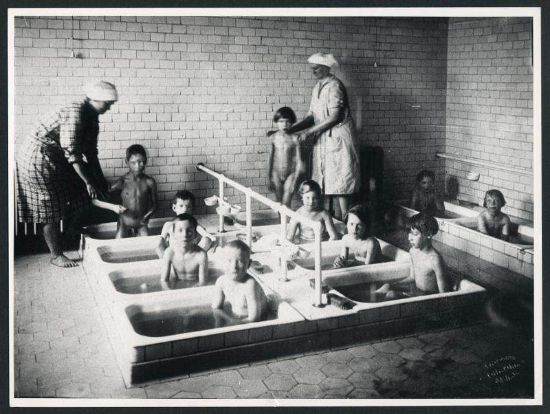 Två baderskor hjälper till att tvätta badande små flickor och pojkar. Okänt årtal.