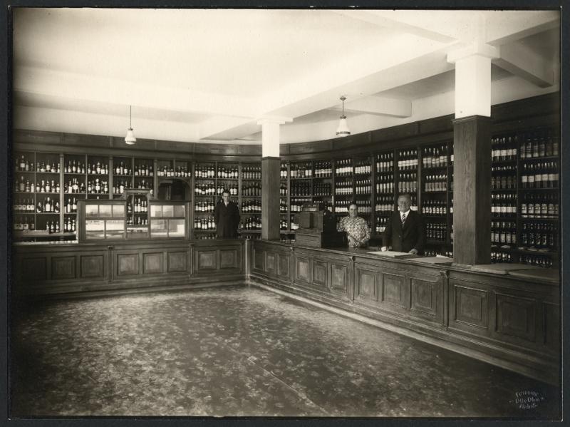 Stort rum med långa diskar och hyllor längs med väggarna fulla med flaskor. Bakom disken står två män och en kvinna. Okänt årtal.