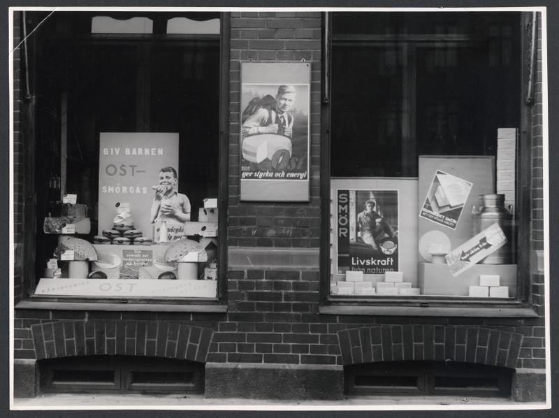 Skyltfönster med ostar och reklam för ost. Okänt årtal.