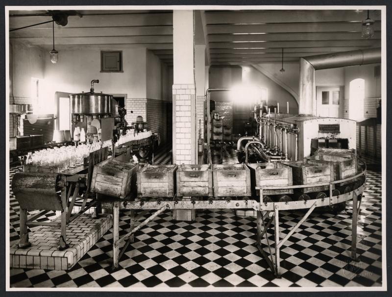 Fabrikslokal med rullbord, trälådor och glasflaskor. Okänt år.