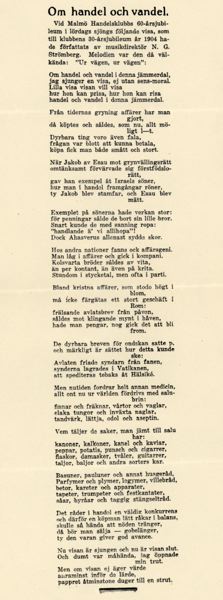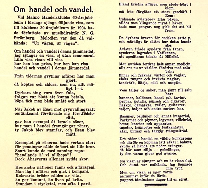 Text: Om handel och vandel / Vid Malmö Handelsklubbs 60-årsjubi- / leum i lördags sjöngs följande visa, som / till klubbens 30-årsjubileum år 1904 ha- / de författas av musikdirektör N. G. / Strömberg. Melodien var den då väl- / kända: "Ur vägen, ur vägen": /---/.