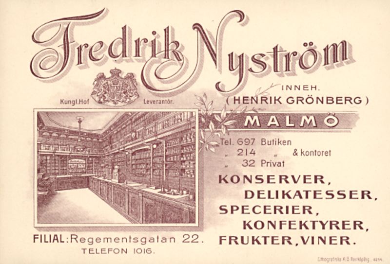 - Reklamkort, tryckt på kartong. Informationstext med adressuppgifter och telefonnummer. Kortets högra del upptas av interiörbild av huvudbutiken. Text: Fredrik Nyström / Inneh. / (Henrik Grönberg) / Malmö / ---/.