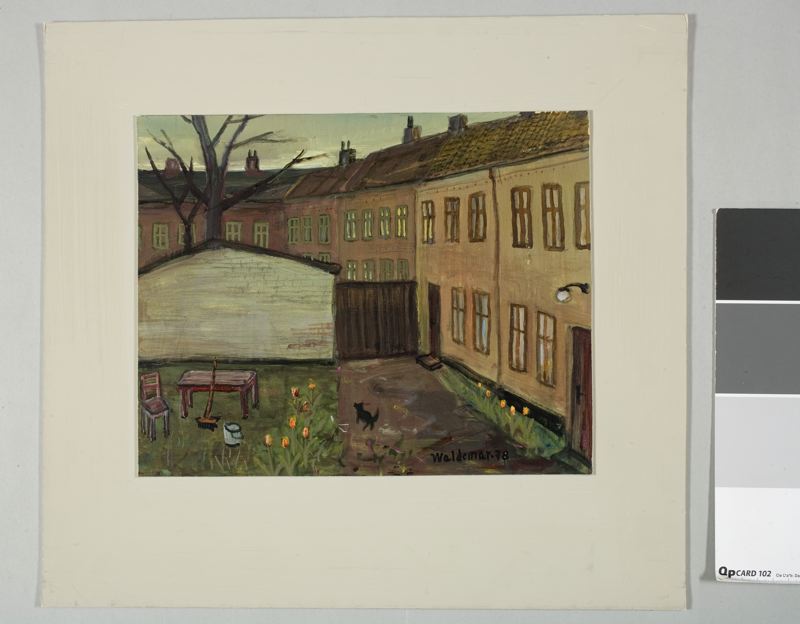- Vi befinner oss på gården till Stålgatan 7 i Gamla Lugnet. Från höger bildkant sträcker sig en husrad i två våningar in mot bildens mitt där den ansluter till en annan husrad i rät vinkel ut mot vänster bildkant. Tvärs över bildens mitt finns en tomtgräns med ett brunt plank närmast husraden t.h. och gaveln på ett ljust bemålat gårdshus t.v. I nedre bildhalvan ser vi gården och trädgården till Stålgatan 7, t.v. en gräsmatta med blomsterplantering och trädgårdsmöbler, t.h. en grusgång och intill huset en smal remsa med blomster. På grusgången syns en svart katt, mot trädgårdsbordet lutar sig en kvast och framför denna syns en hink.
