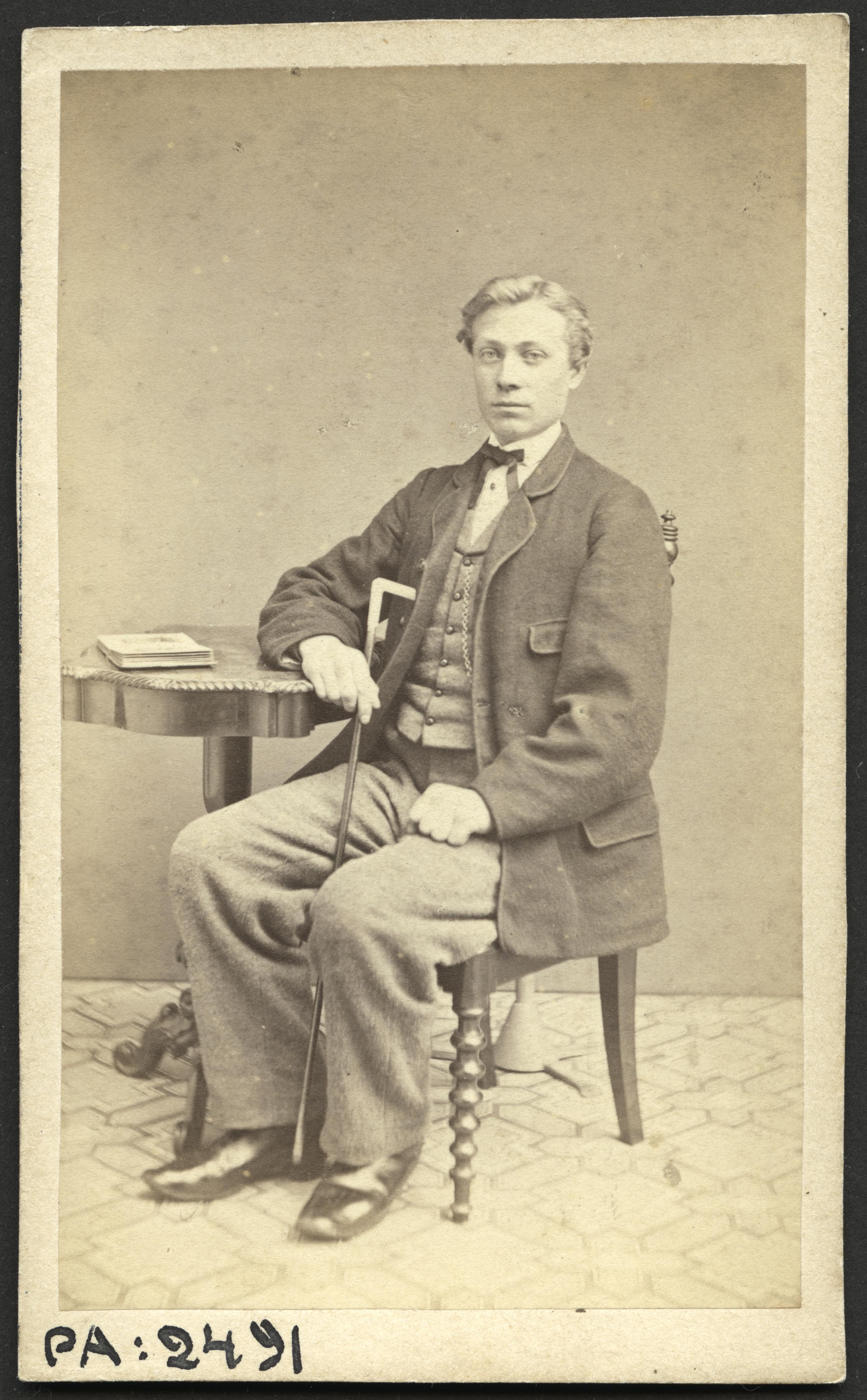 PA 002491 :: man, käpp, bord, bok, stol