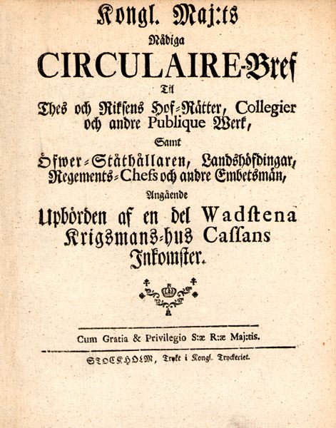 Titel: Kongl. Maj:ts Nådiga Circulaire-Bref Til Thes och Riksens Hof-Rätter, Collegier och andre Publique Werk, Samt Öfwer-Ståthållaren, Landshöfdingar, Regements-Chefs och andre Embetsmän, Angående Upbörden af en del Wadstena Krigsmans-hus Cassans Inkomster.