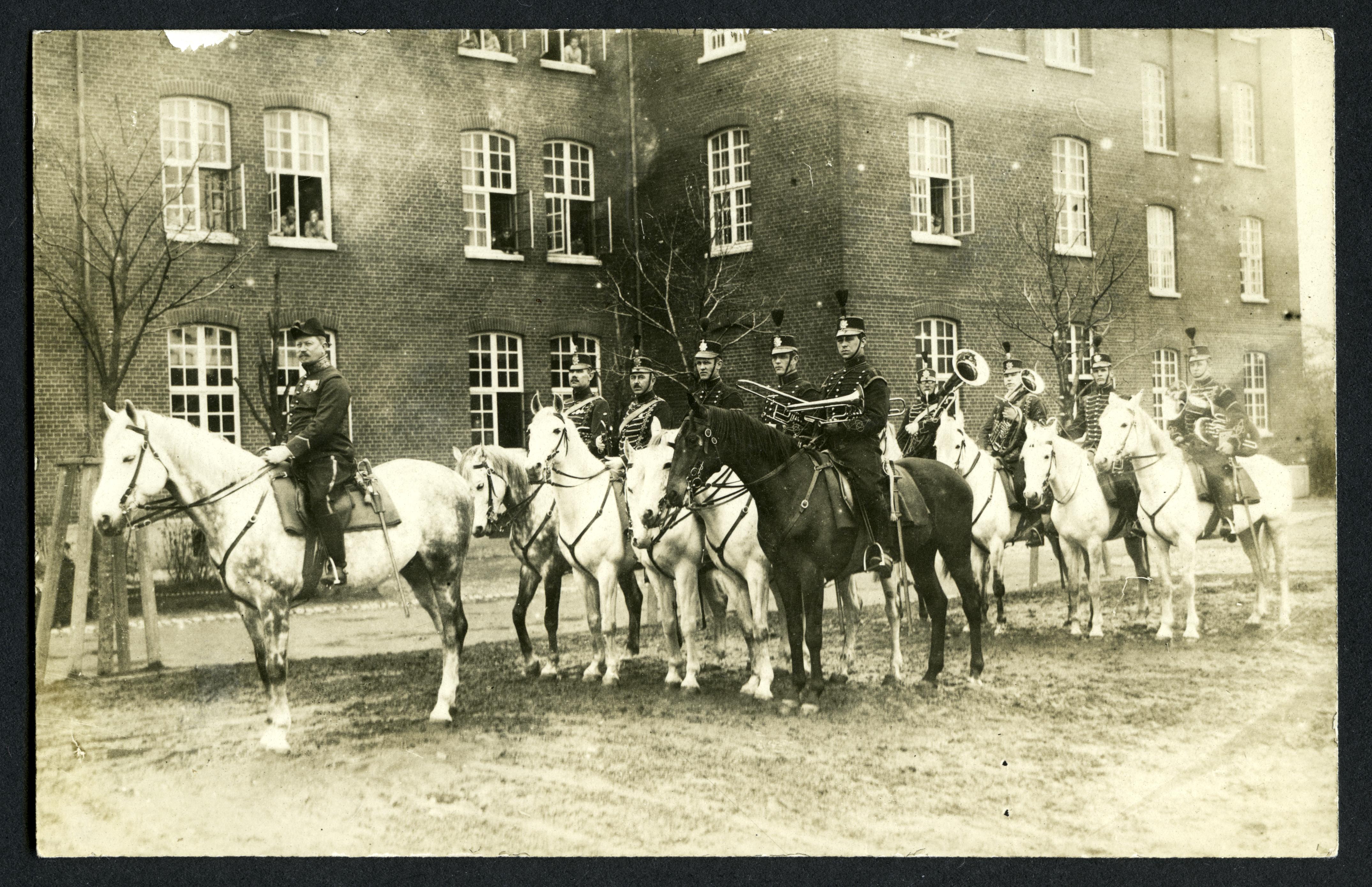 KPH 000175 :: husarregemente, husarregementen, kaserngårdar, man, musikkår, män, husar, kaserngård, husarer, kronprinsens husarregemente, kavalleriet, häst, musikkårer, hästar