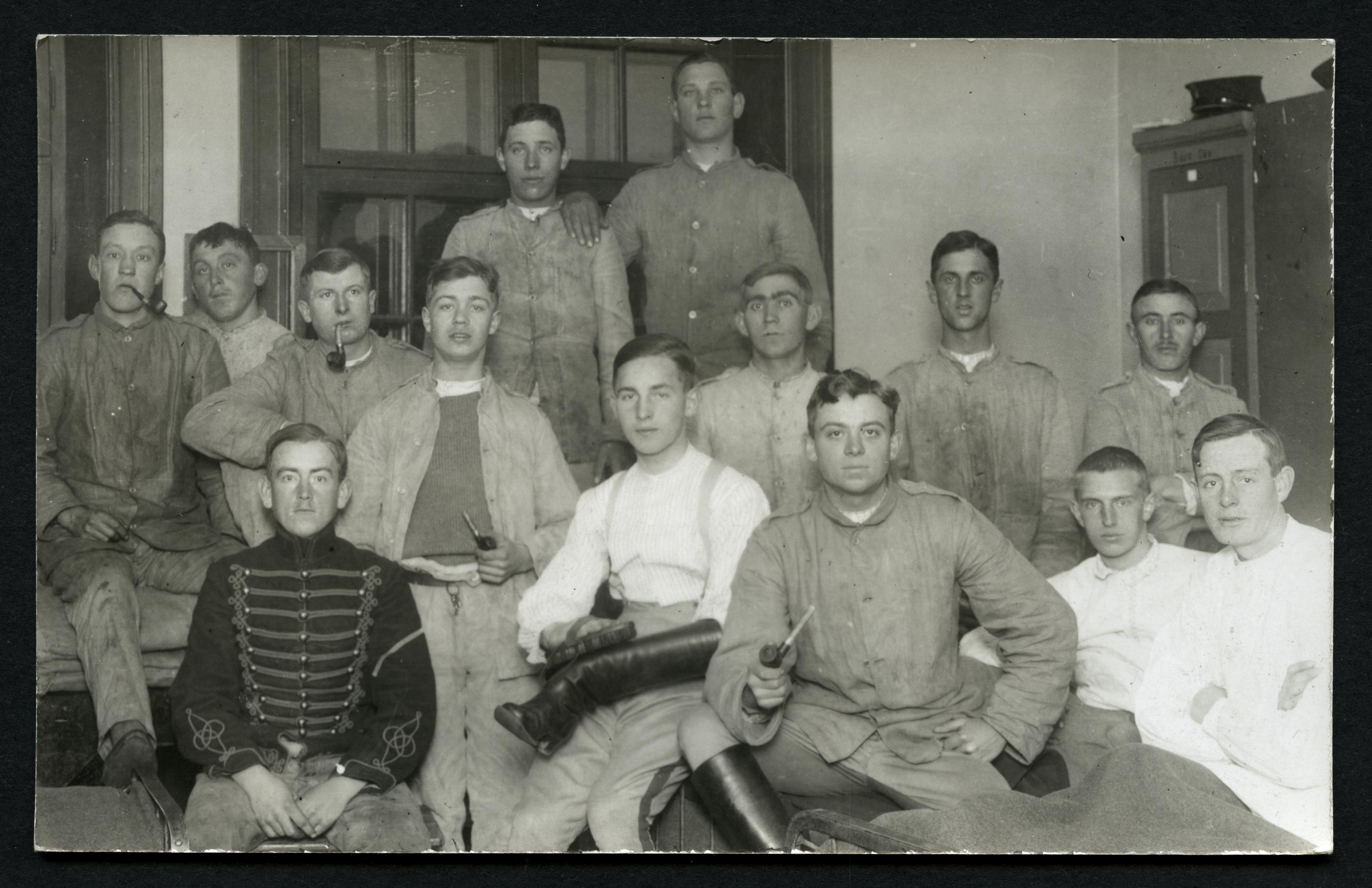 Grupp husarer i arbetskläder. Ca 1920.