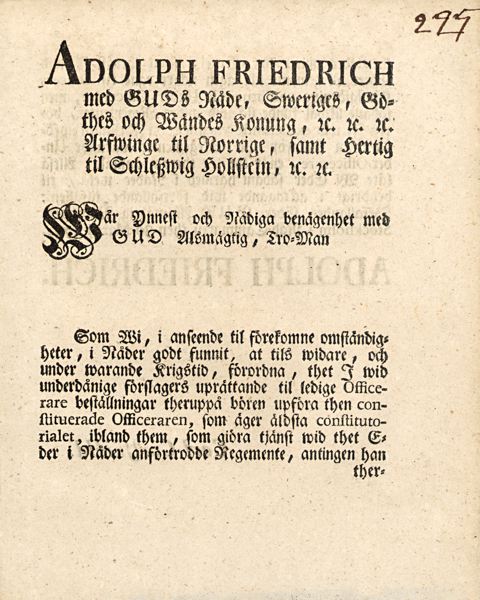 Titelsida: Adolph Friedrich med Guds Nåde, Sweriges, Göthes och Wändes Konung ... the I wid underdånige förslagers uprättande til ledige officerare beställningar therupå bören upföra then constituerade Officeraren, som äger äldsta constitutorialet ...