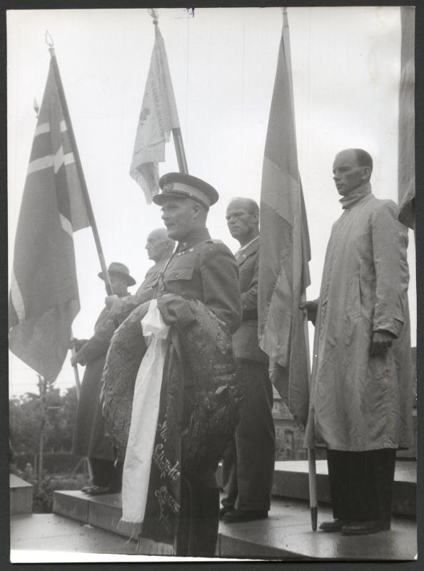 - Södra skåningarnas kamratförening 10-årsjubilerar. Överste Bennicke, Danmark nedlägger en krans vid monumentet i Lund, den 5 juli 1947.