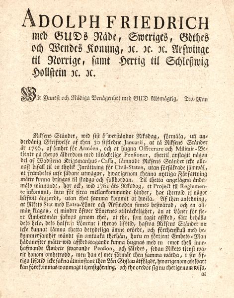 Titelsida: Adolph Friedrich med Guds Nåde, Sweriges, Göthes och Wendes Konung ... tå Riksens ständer år 1756, af ömhet för arméen, och at hugna officerare och militaire-betjente på theras ålderdom med tilräckelige pensioner, thertil anslagit någon del af Wadstena krigsmanshus-cassa, lämnade Riksens ständer icke allenast bifall til en thylik inrättning för Civil-Staten ...