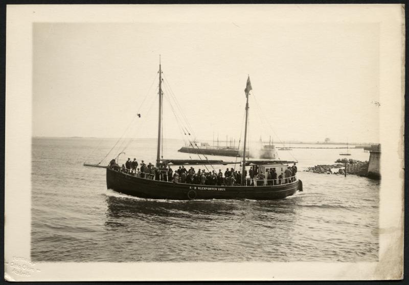 Passagerare på en båt på väg ut till havs. Okänt årtal.