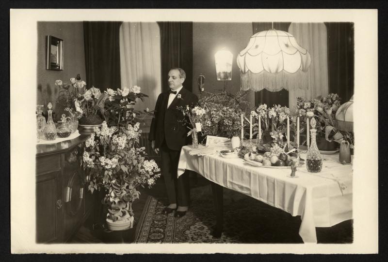 En man står vid ett bord med blommor och frukt.Okänt årtal.