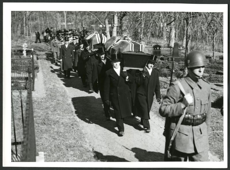 - Bilden visar de båda fan behängda kistorna bäras i procession från kyrkan till graven på Sövde nya kyrkogård.