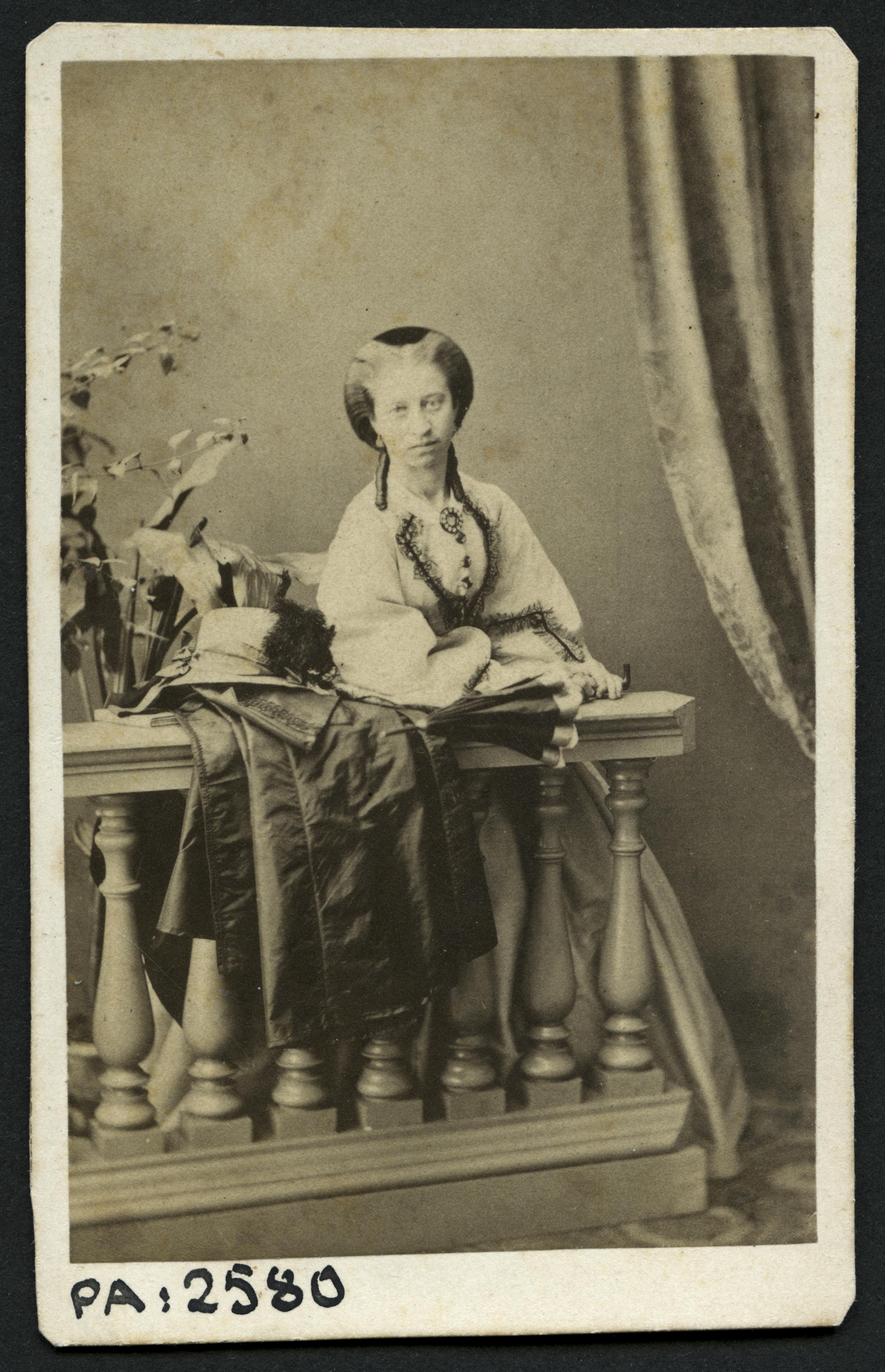 PA 002580 :: kvinna, klänning, balustrad, damkappa, draperi, staket, växt