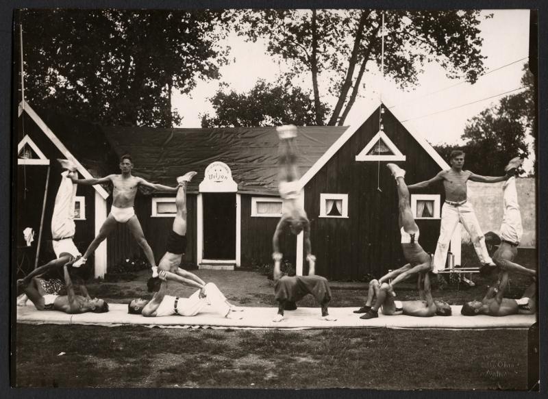 Gymnastikuppvisning, manliga atleter uppför en uppvisning utomhus på en lång gymnastikmatta. Frisksportklubben Viljan.