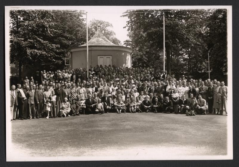 Stor samling människor står och sitter på en öppen yta framför en mindre byggnad i parkmiljö.