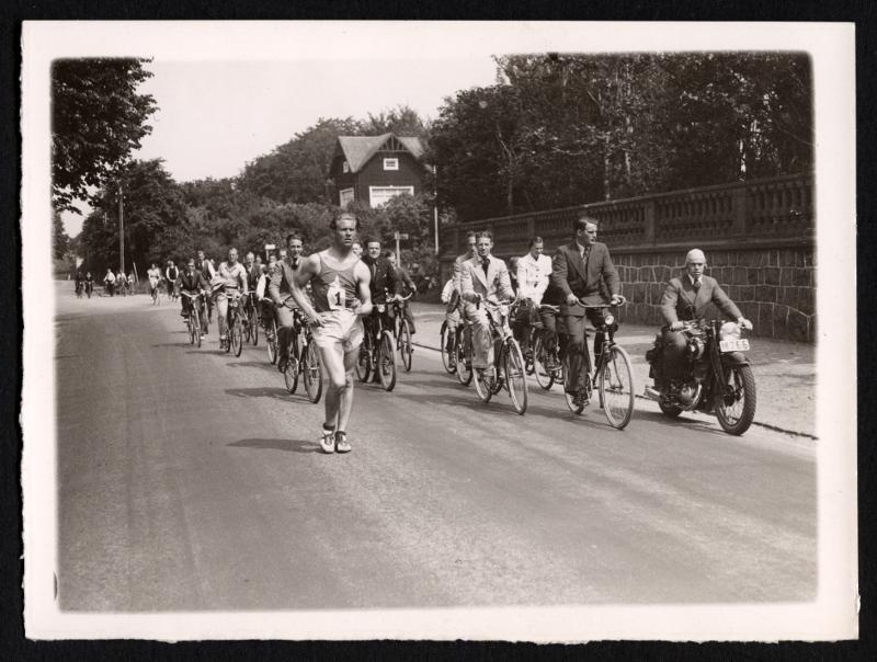 Gång- eller löpartävling, en tävlande med nummerlapp på bröstet omgiven av cyklister och en motorcykelförare.