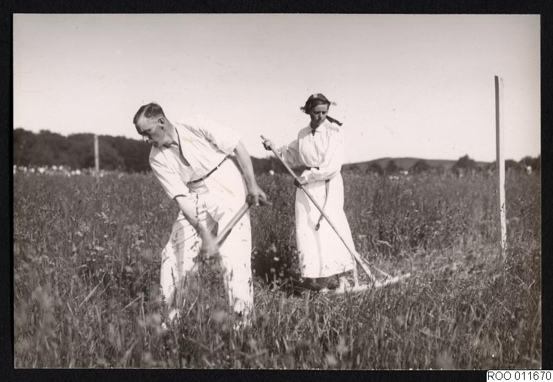 En man och en kvinna på en äng med en lie respektive räfsa.