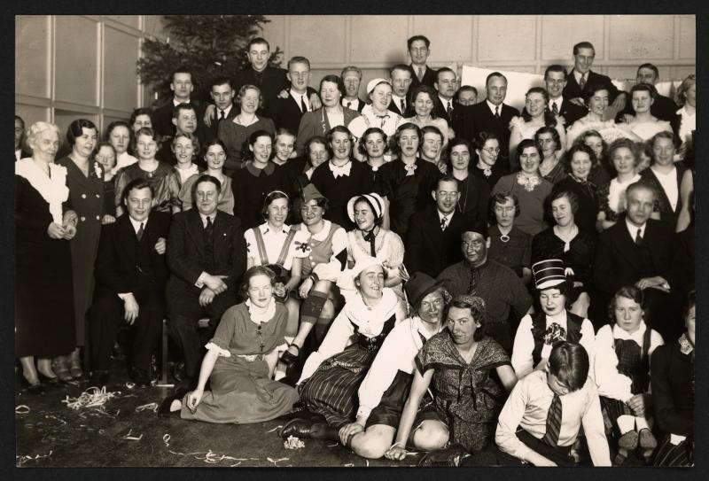 Gruppbild. Män och kvinnor på fest, några är utklädda. Okänt årtal.