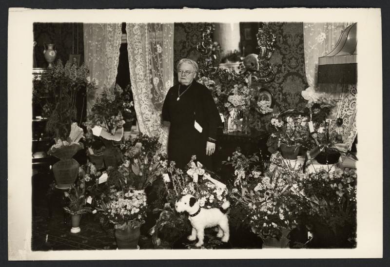 Kvinnoporträtt. Kvinna med sin hund, omgiven av blommor.
