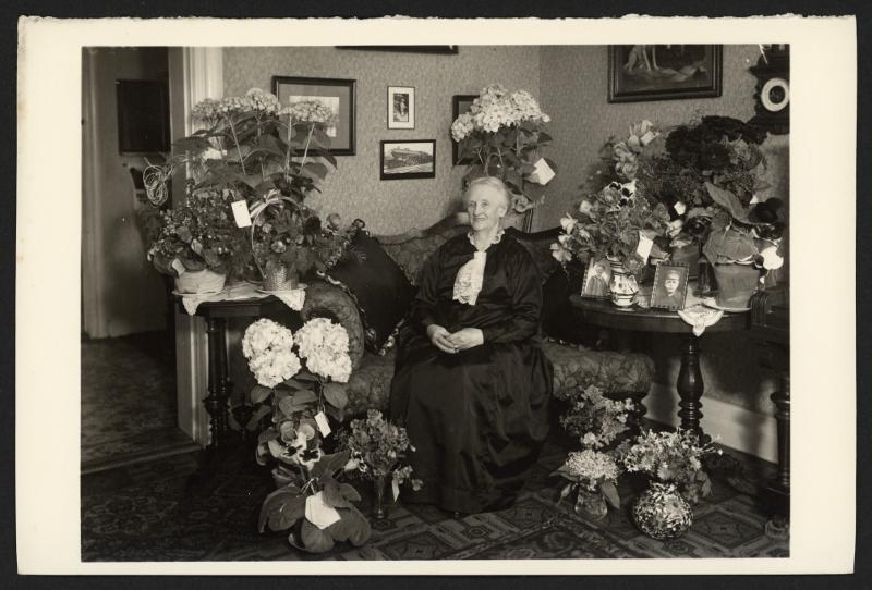 En kvinna sitter i en soffa omgiven av blommor. Okänt år
