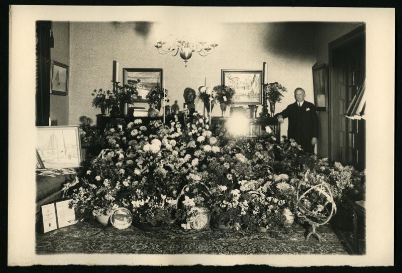 Erik Roswall omgiven av blommor och presenter. Okänt år