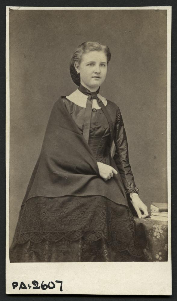 PA 002607 :: kvinna, klänning, bord, böcker