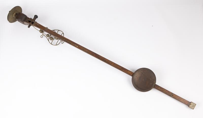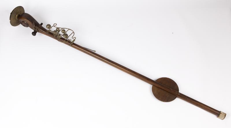 Bumbass, bladder fiddle [eng], en träkäpp med skulpterat krön, i form av snäcka. Överst två runda mässingsplattor, vid ena sidan bjällror, vid den andra rester av en sträng.