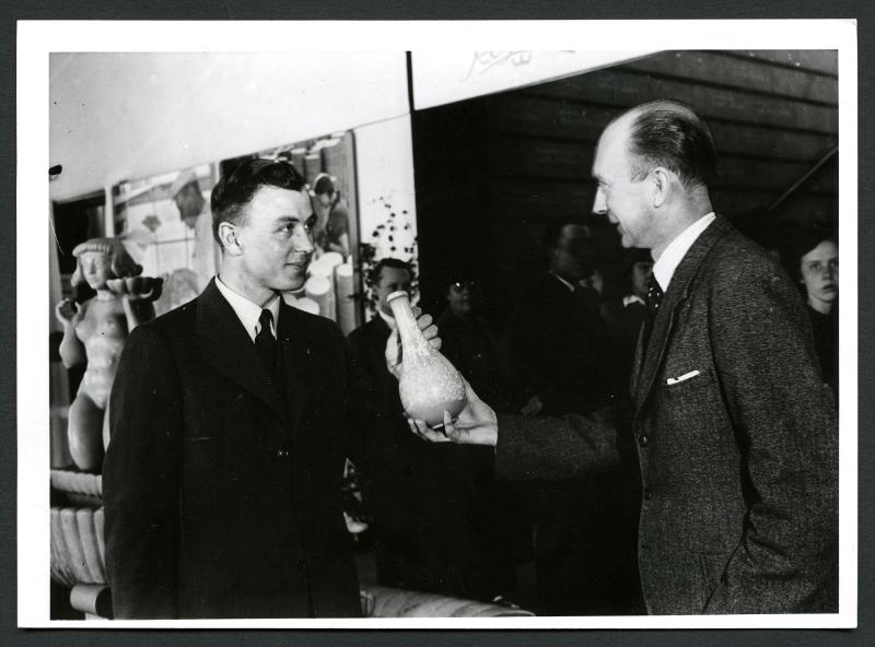 - Tursamt museibesök. På Malmö museum pågår för närvarande en Rörstrands utställning, vilken på söndagen noterade det 5000:de besöket, och denna siffra blev det herr Ingolf Rosengren som registrerade. För detta erhöll han ett äkta stengodskrus i mimosaglassyr, vilket överräcktes av greve Sten Kalling t.h.
