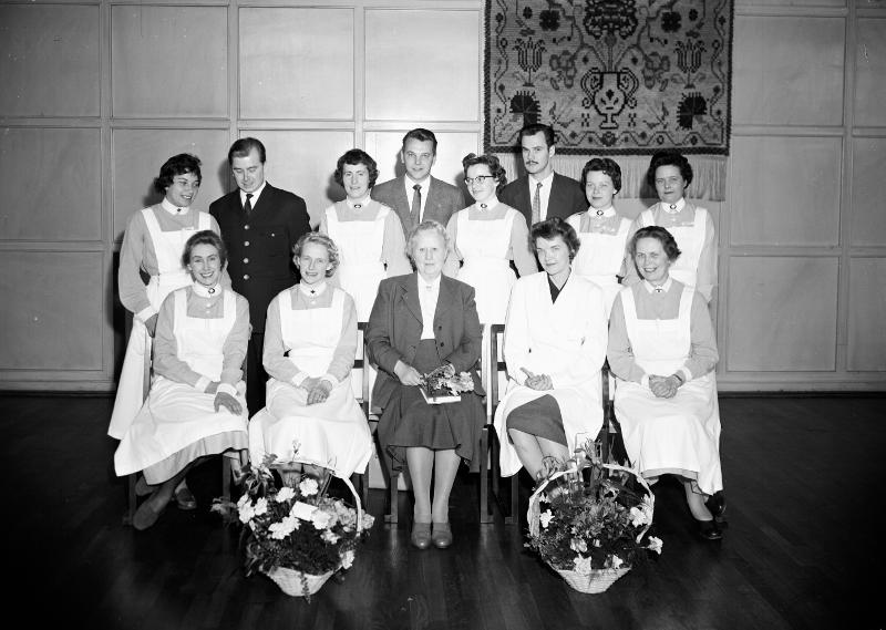 - Inomhusbild som visar en kursavslutning på Östra Sjukhuset med elever och dr Moell. Bilden är tagen den 17 april 1959.