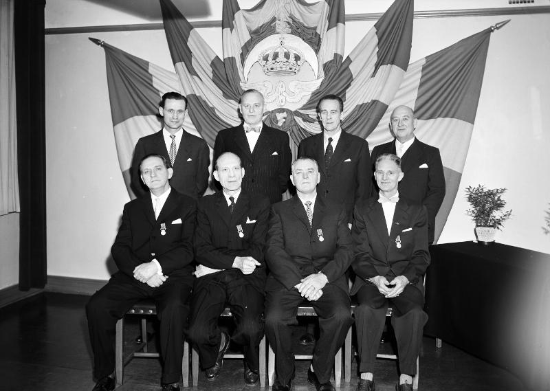 - Inomhusbild som visar ett gruppfoto av 8 män från SJ Verkstäder, Bulltofta, vid en medaljutdelning den 19 december 1959. Bilden är tagen av Jerke.
