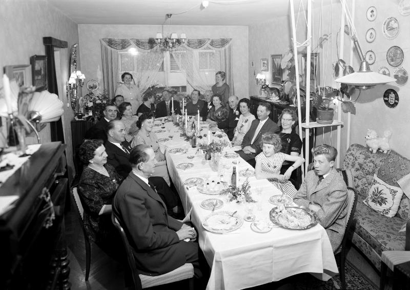 - Inomhusbild som visar brudparet Fredin med sällskap sittande till bords på Fågelbacksgatan 35. Bilden är tagen efter bröllopet påskafton den 16 april 1960.