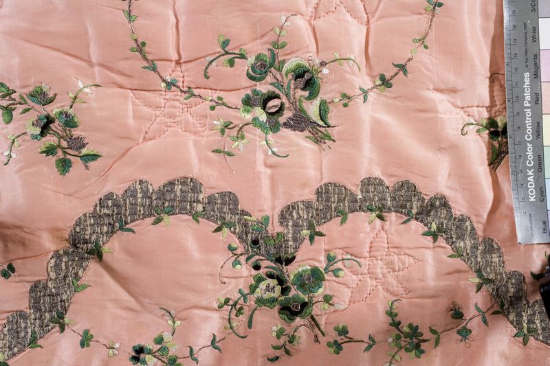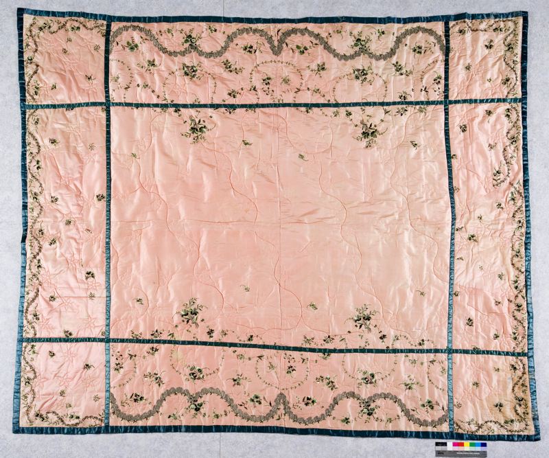 Täcke vadderat, av rött siden med broderier av silke i grönt och vitt