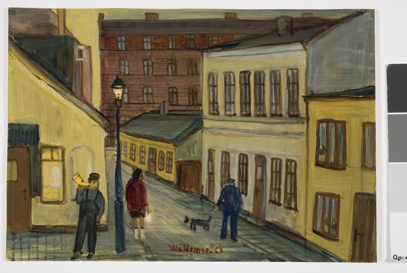 - Vi befinner oss i korsningen Lorenzgatan / Östra Långgatan i gamla Lugnet och vänder blicken åt nordväst. Östra Långgatan syns i bildens nedre kant med hörnhuset i kv Orren i vänsterkanten. Det är ett gulputsat envåningshus med butiksingång på gaveln och en stor vindskupa på taket. I gathörnet står en grönmålad tänd gatlykta och t.v. om denna en man i blåställ som ger signal i en mässingslur, förmodligen för att varsla om avstängning av vatten eller liknande. T.h. om gatlyktan syns en kvinna i röd kappa och t.h. om henne en man med en hund i koppel. Han är på väg neråt Lorenzgatan som sträcker sig i snett perspektiv från bildens nedre högra hörn in mot mitten där man skymtar anslutningen till Västra Långgatan. Vi ser bebyggelsen utmed Lorenzgatans norra sida. Först ett gulputsat envåningshus med tak av tjärpapp. Därefter ett rödmålat plank fram till grannhuset som är uppfört i två våningar och har två entrédörrar. Intill detta ser vi i bildens högerkant ett gulputsat tvåvåningshus, dock lite lägre än grannhuset. I bildens fond syns ett fyravånings rödbrunt tegelhus sträcka sig tvärs över bilden längs Västra Långgatan.