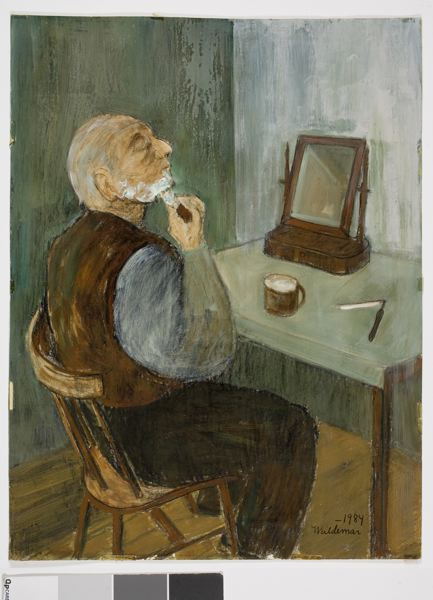 - Vi ser en äldre man sittande på en pinnstol vid ett bord. Han är klädd i mörka byxor, ljus skjorta och brun väst. Vi ser honom snett bakifrån med ansiktet i profil, han är i färd med att raka sig och borstar upp raklödder på hakan. På bordet framför honom ligger en grågrön vaxduk och på denna ser vi en rakspegel, eller "pigtittare", en kopp med raklödder och en rakkniv. Rummets grågröna väggar möts i ett hörn mitt i bilden, brädgolvet har en brun ton.