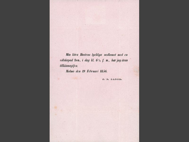 har jag äran/ tillkännagifva./ Malmö den 19 februari 1856."
