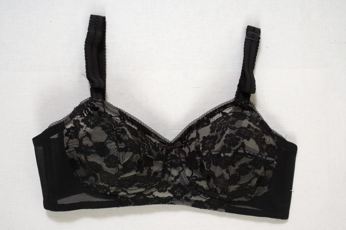 - Svart spetsbh i nylon och lycra. Tredelade kupor av maskinknypplad tyllspets, fodrade med ljusbeige nylontrikå. Baktill elastiskt svart "nät". Knäpps bak med tre par hyskor och hakar. Reglerbara, elastiska axelband.