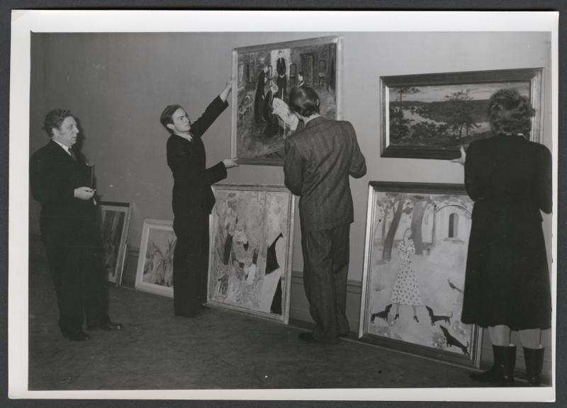 - Skånska konstmuseum 80 80 år. Lunds Universitets Konstmuseum firar i år sitt 80 - årsjubileum, vilket celebreras med en utställning "80 år" som öppnas på söndag: bilden visar hägningen under öveinrseende av fr.v. professor Josephson. Utställningskommissarien fil. stud. Bo Lindwall och fil. stud. Sven Ahlfors hållande Gideon Börjes "Det döda barnet" (1921) och fil. stud. Elsa Grave hållande Prins Eugens "Det stilla vattnet" (1898) därunder Ejnar Jollins "Flicka med hundarna" (1917). Konstut. Skåne