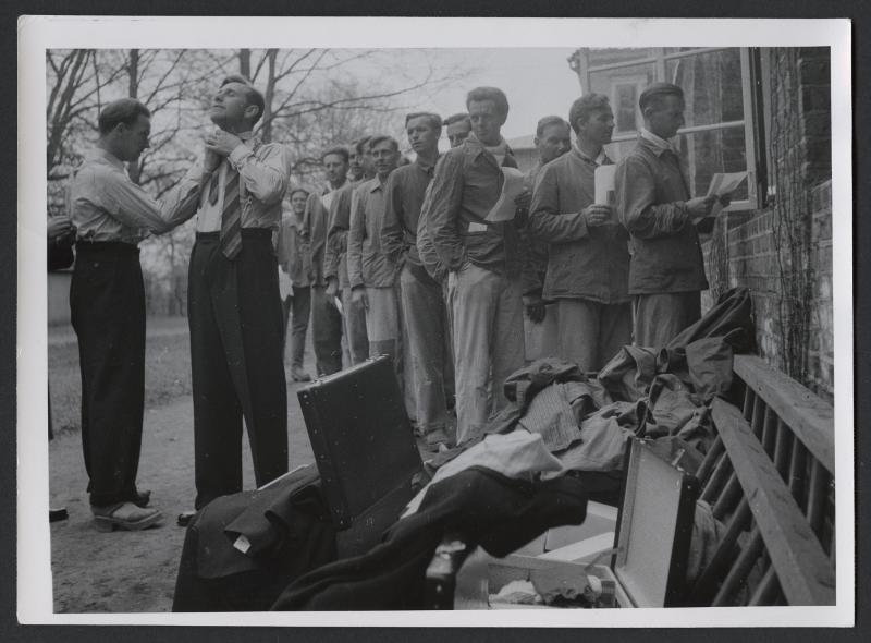 - Krigsfångar 1945. Stämpel: Sk. Ds. bildarkiv avd. Malmö, krigsfångar från tyska koncetrationsläger. Norska polismän utrustas. Från koncetrationsläger. Norska polismän erhåller här fullständig civil beklädnad. Bilden tagen i Ramlösa brunn.