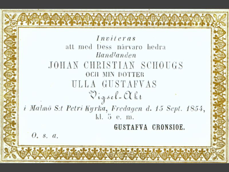 Inbjudan till vigsel på vit papp med tryck i svart och guld.