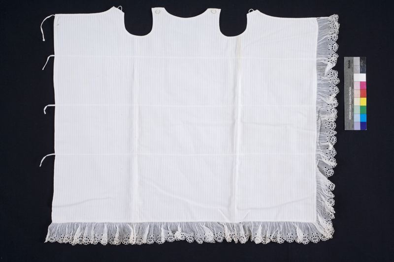 Bärdräkt av vitt randigt bomullstyg kantad nedtill och framtill av maskinbroderad brodyr av moll.