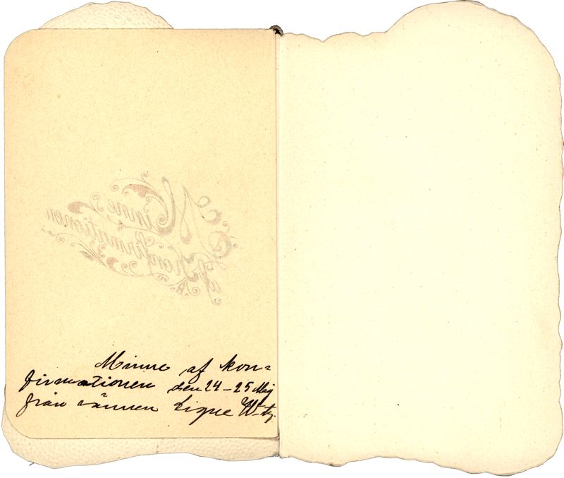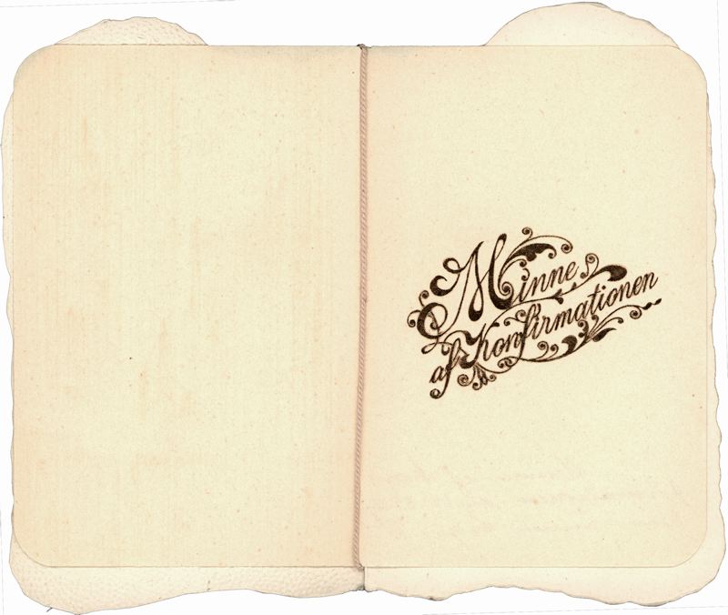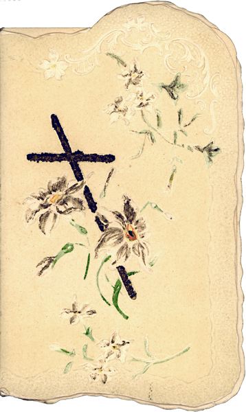- Konfirmationskort, av papper med relieftryckt dekor. Bild föreställande kors i blom- och bladverk. Tryckt skrift på insidan: Minne af konfirmationen. Inlaga med handskrift: Minne af konfirmationen / den 24-25 Maj / från vännen Signe W-tz.
