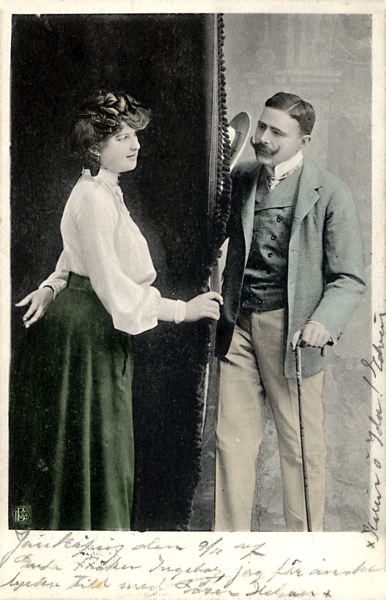 Gratulationskort, färgtryck på kartong. Motiv föreställande man och kvinna i samtal. Kortet poststämplat 1907.